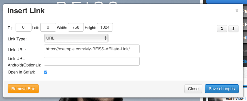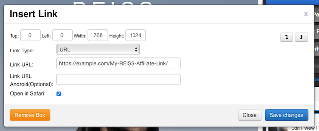 Step 5b: Set the dimensions. Add the link. Set Safari opening option.