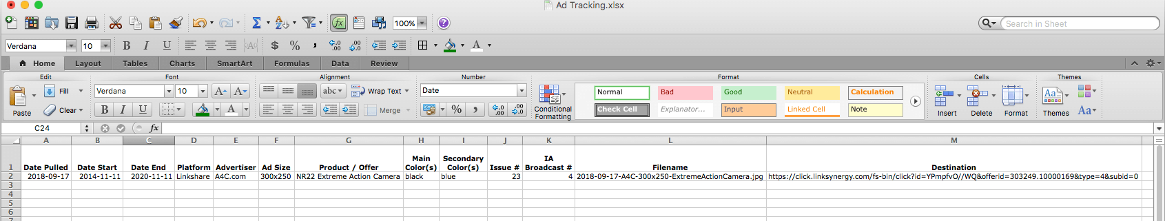 You only need to copy the portion that starts with http (WITHOUT the ") and goes to the character before the next ". To reiterate: DO NOT INCLUDE THE QUOTATION MARKS and DO NOT SAVE the whole block of code (which it will invariably default to.) OK, so you've pulled your first ad and grabbed the destination web page. Now what? Paste the link into a new browser / new tab and confirm that it works. 999/1000 it will. Sometimes it doesn't. This is YOUR money at stake; don't trust your money to some webmaster having 100% of their links working. Organizing Your AdsDespite the length of this HOWTO page, in no time, you'll have dozens or hundreds of ads in your stable to use.Naming, storing, and tracking them starts to matter: you want something organized here, not a cesspool, which is why we're sharing our Ad Tracking Spreadsheet. Making long-term sense of your ads with it is really easy. Consider storing this spreadsheet in Zoho or Google Docs so you've got access to it from multiple places and to minimize the chances of something tragic happening to it: it's about to become important to your money. Here's what it looks like: |