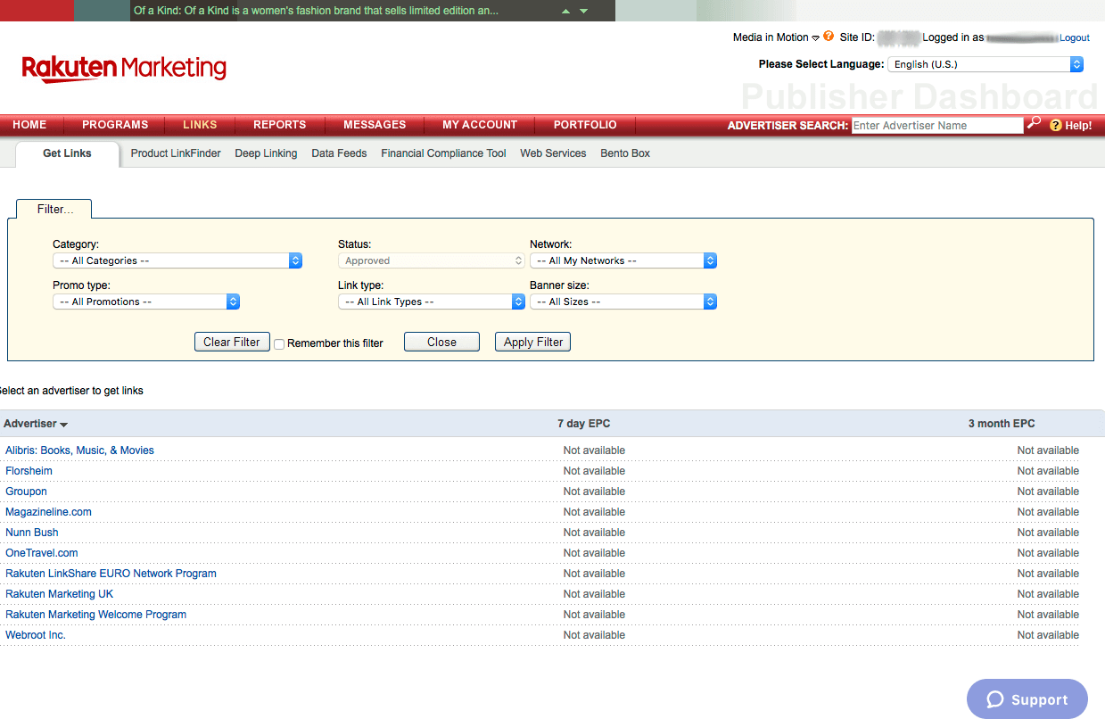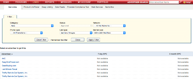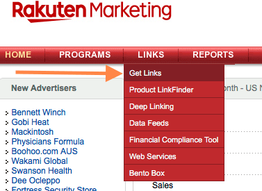 Then... Each network's system is different, so rather than going into a step-by-step in all of them, it's important to understand the concepts rather than the unique step-by-steps for each network. We'll use Linkshare (aka Rakuten) as an example. Once you've been approved by a merchant, you'll want to head to the [Links] section, like this: