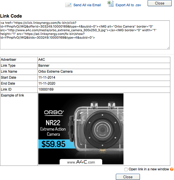 I suggest this naming convention: YYYY-MM-DD-AdvertiserName-Size.png/jpeg/gif This image name would be saved like this: 2018-09-17-A4C-300x250-ExtremeActionCamera.jpg Next, it's time to grab the link the advertiser wants you to send your visitors to, so click [Get Link] as shown here: