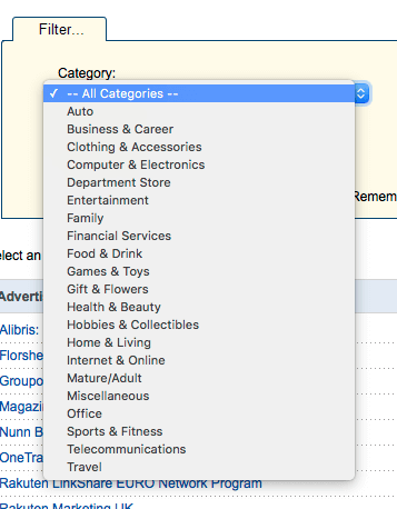 Depending on your need, you'll can hop around between categories, dive straight into an advertiser, or start by selecting the ad sizes you need. For our purposes here, we're going to start with the Category first. Choose a Category