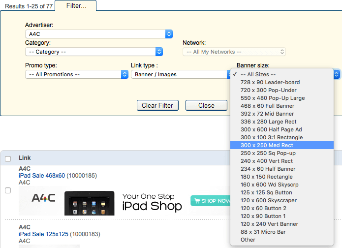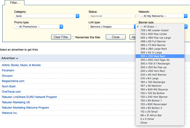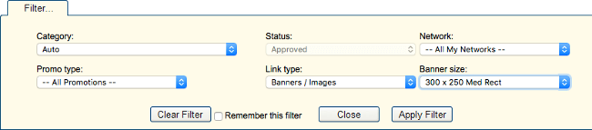 Apply Filters... AgainUnfortunately, in Linkshare even though you've already specified that you want 300x250 ads, you have to re-specify it again here: